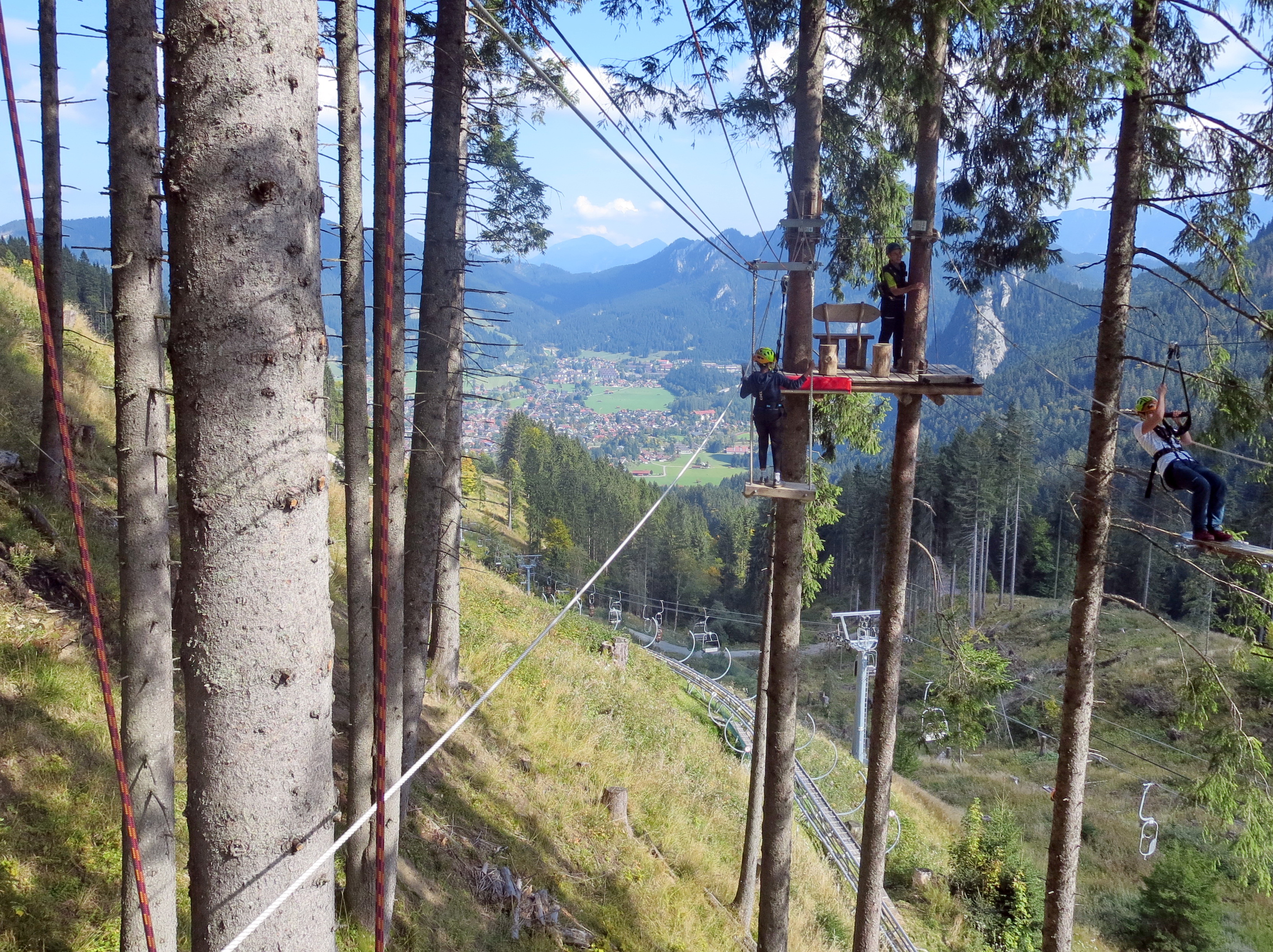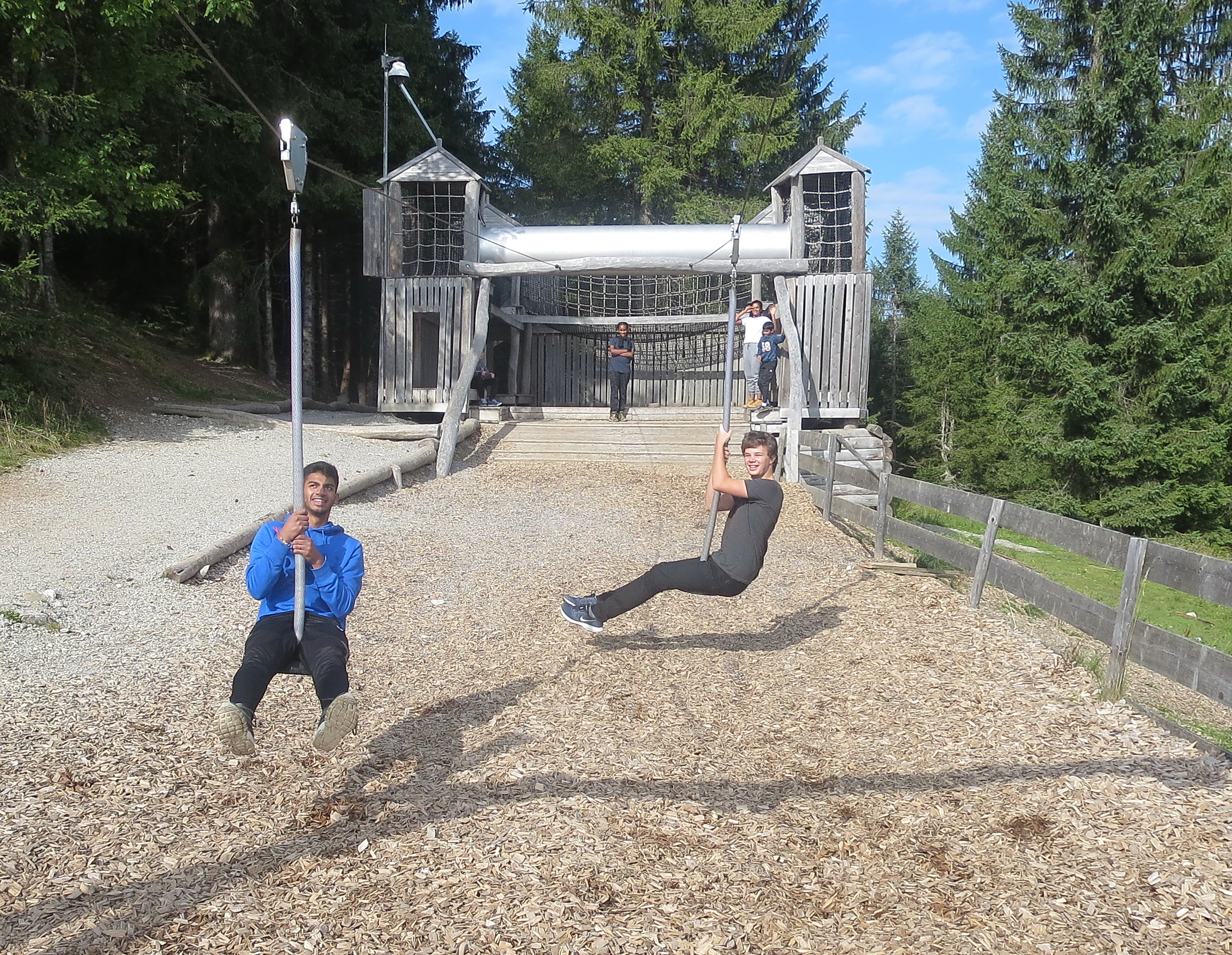 Für den Kletterwald war die vorherige Einweisung durch geschultes Personal Pflicht. Dann gab es Start frei zum selbständigen Klettern auf 8 verschieden schwierigen Parcours mit 73 Übungen in Höhen von 1-16 m. Trotz Benachteiligung durch mangelnde Körpergröße haben auch unsere kleinsten alle Parcours geklettert, manche der größeren einige sogar mehrmals. Die Mannschaft nach mehr als 2 Stunden Klettern wieder aus dem Parcour zu locken, erleichterte die Aussicht auf die nächste Attraktion.