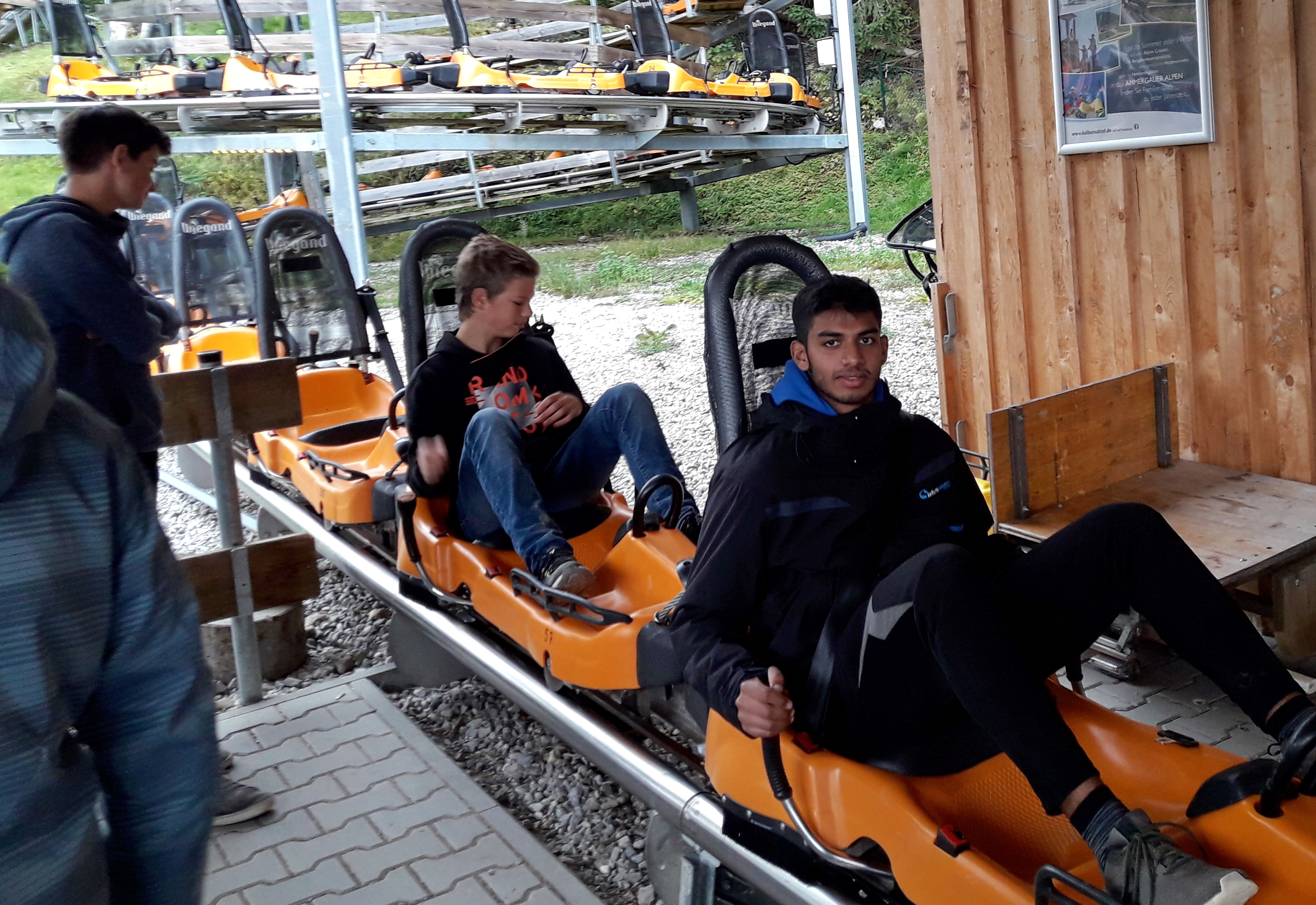 Dies war der Rodelspaß bergab mit dem Alpine Coaster. Nachdem das Personal bei der Mindestkörpergröße von 1,40 m für's alleine benutzen der Rodel die Augen etwas zugedrückt hatte, konnte nun jeder alleine die Streckenlänge von 2.600 m und 400 m Höhendifferenz hinunter rasen. Es gehörte wirklich Mut dazu, die 73 Kurven, 9 Jumps, 7 Wellen mit bis zu 40 km/h Stunde mit möglichst wenig "Angstbremsen" hinter sich zu bringen. Zur Sicherheit bremst ein automatisches System über 40 km/ Stunde die Geschwindigkeit herunter.